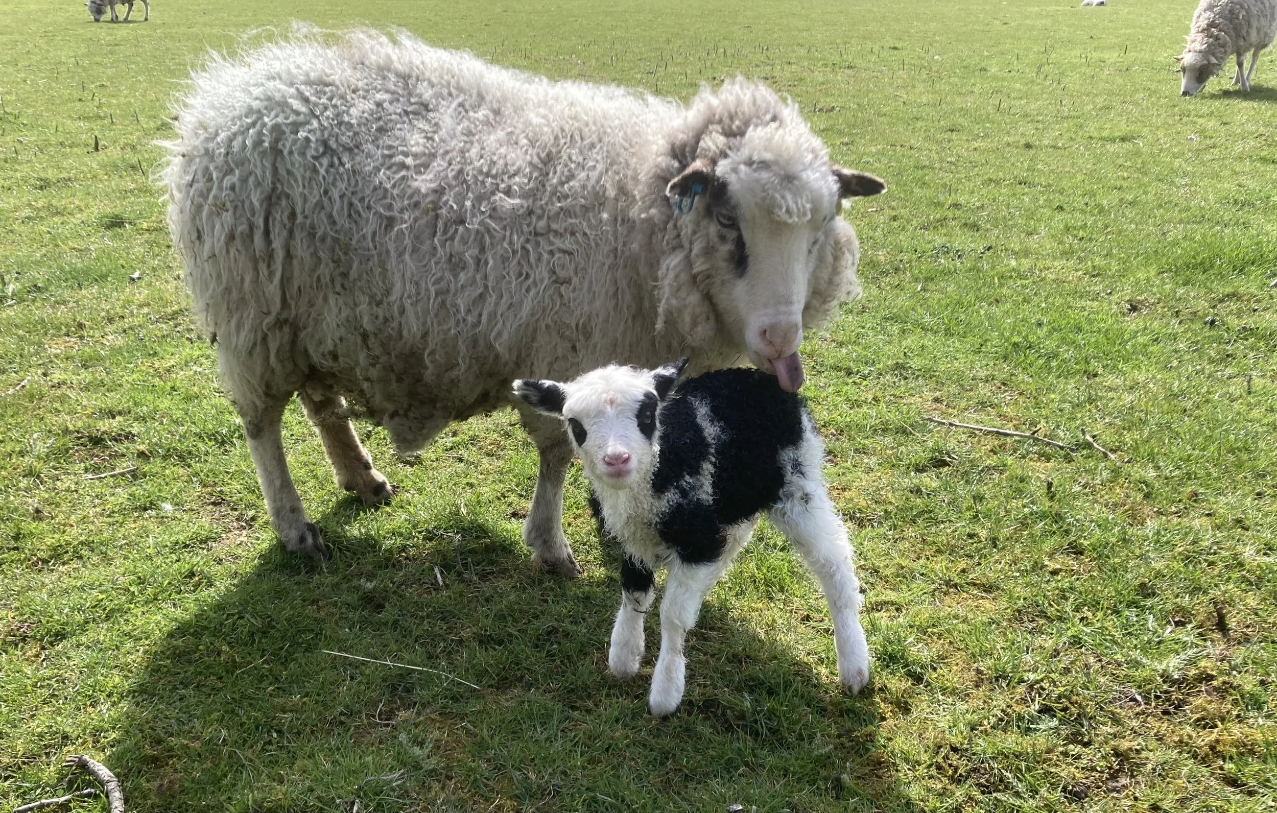 Abacus Bettina with her young ewe lamb, she does have a twin, similar markings that is a wether (castrated ram). Sire is Abacus Grant.